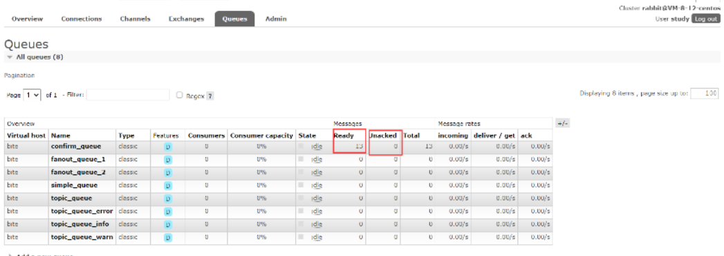 从RabbitMQ的Web管理平台上, 也可以看到当前队列中Ready状态和Unacked状态的消息数