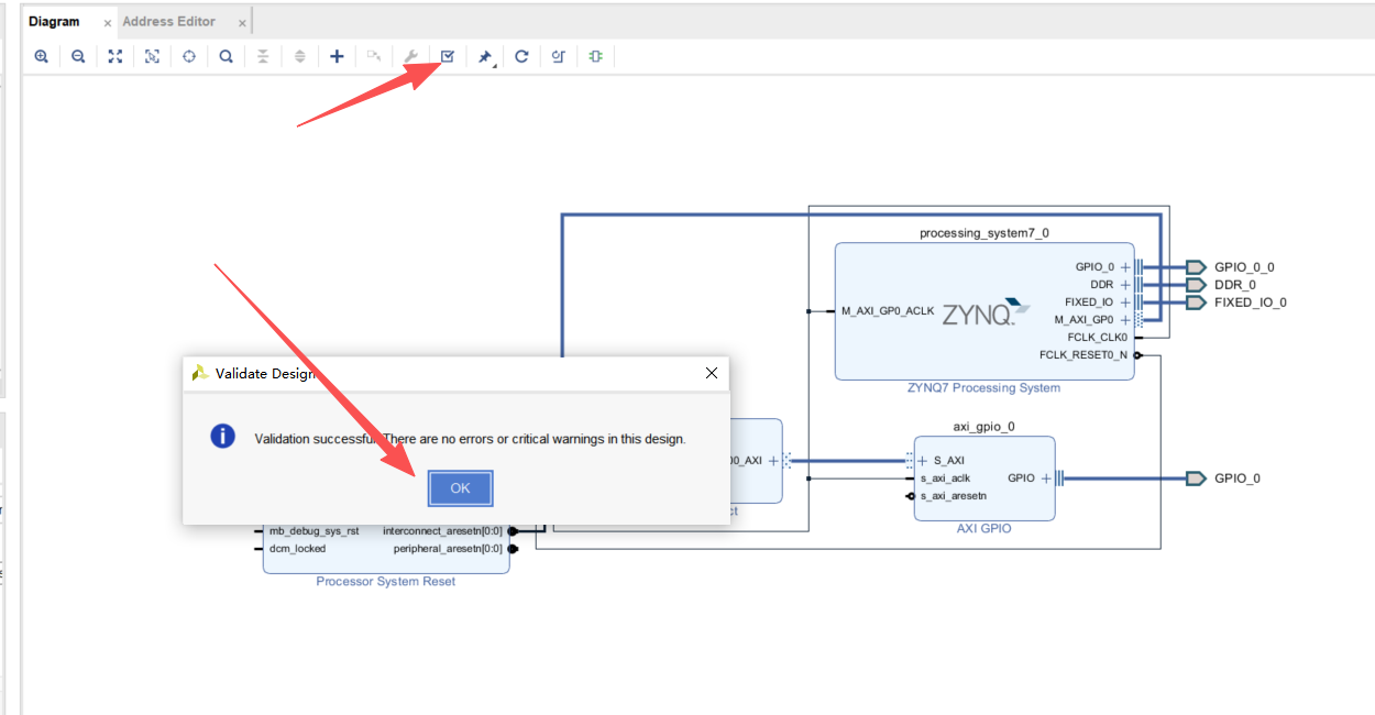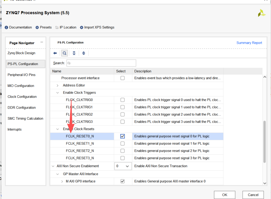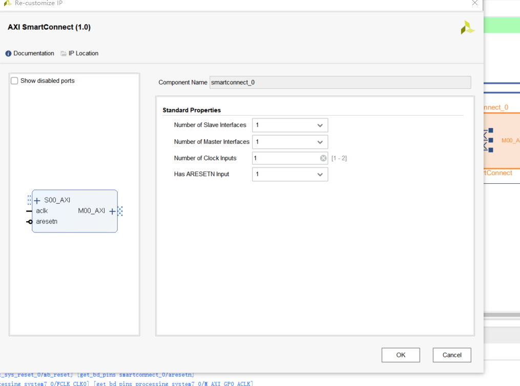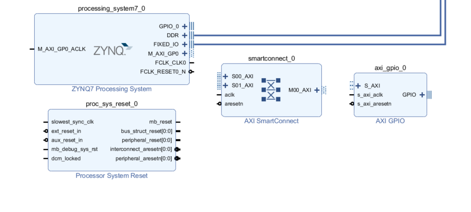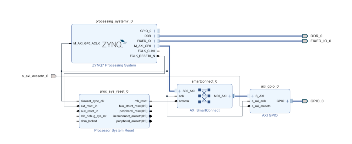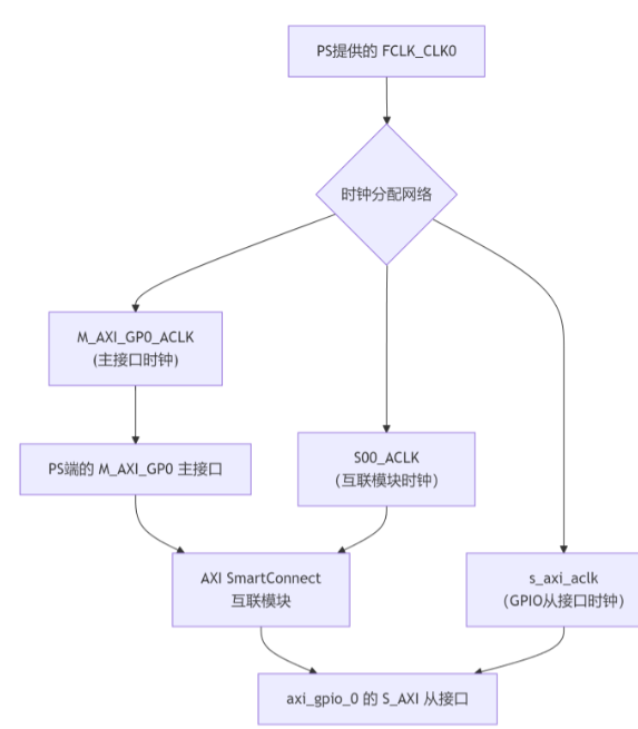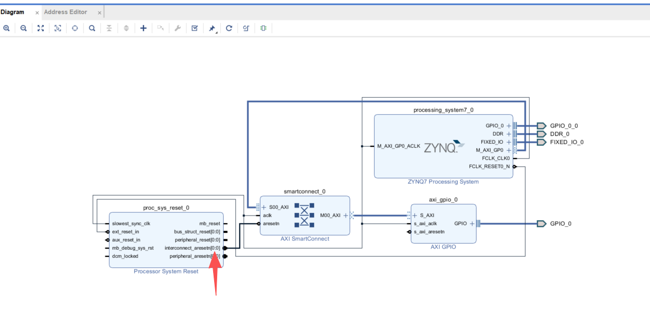 将ps的时钟链接互联模块,以及M_AXIGP0_ACLK,给去全局工作时钟。PS的复位给同步复位模块,然后同步复位给互联模块的复位