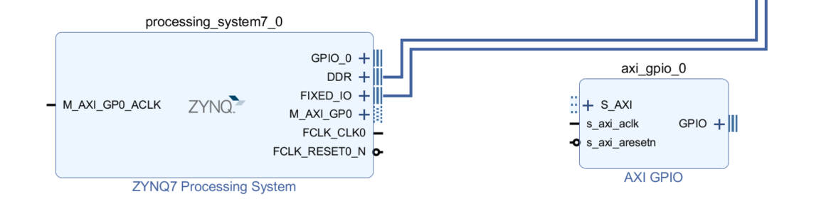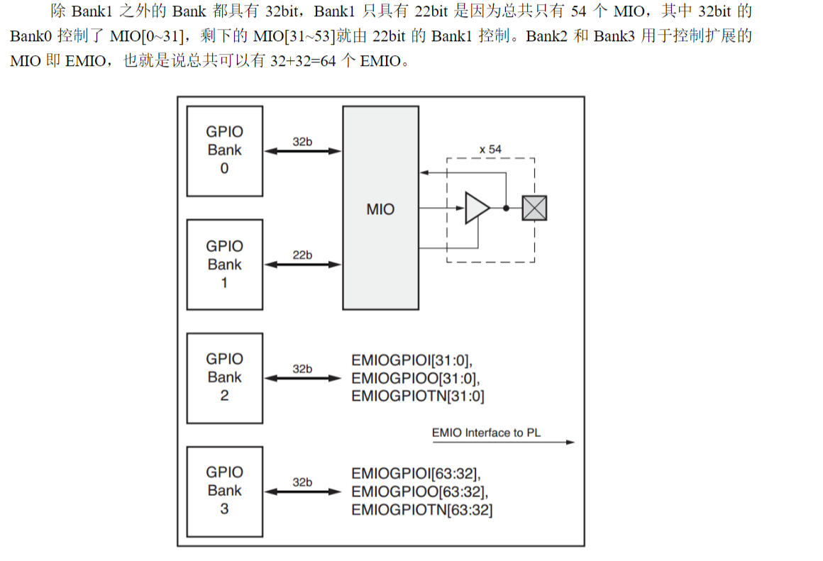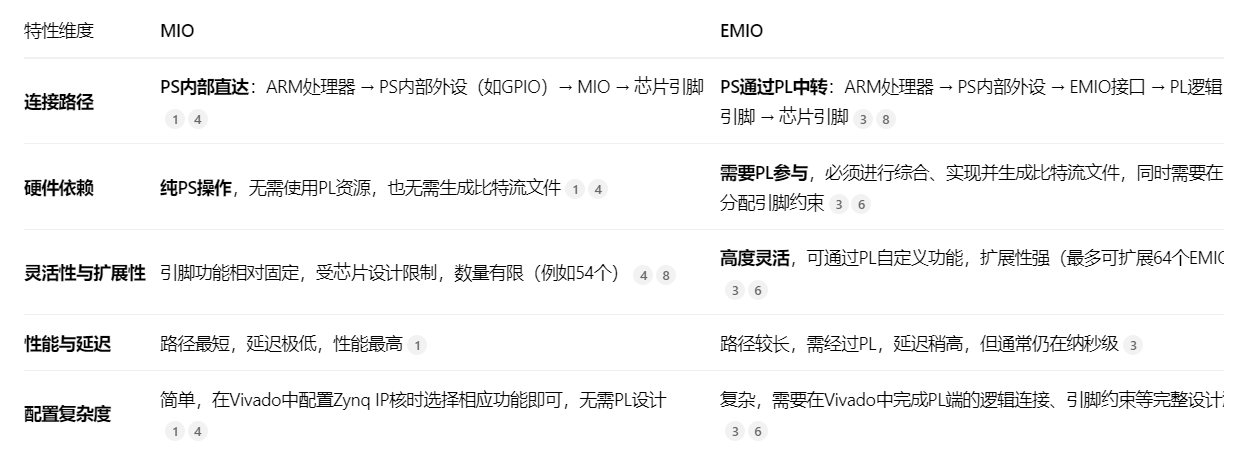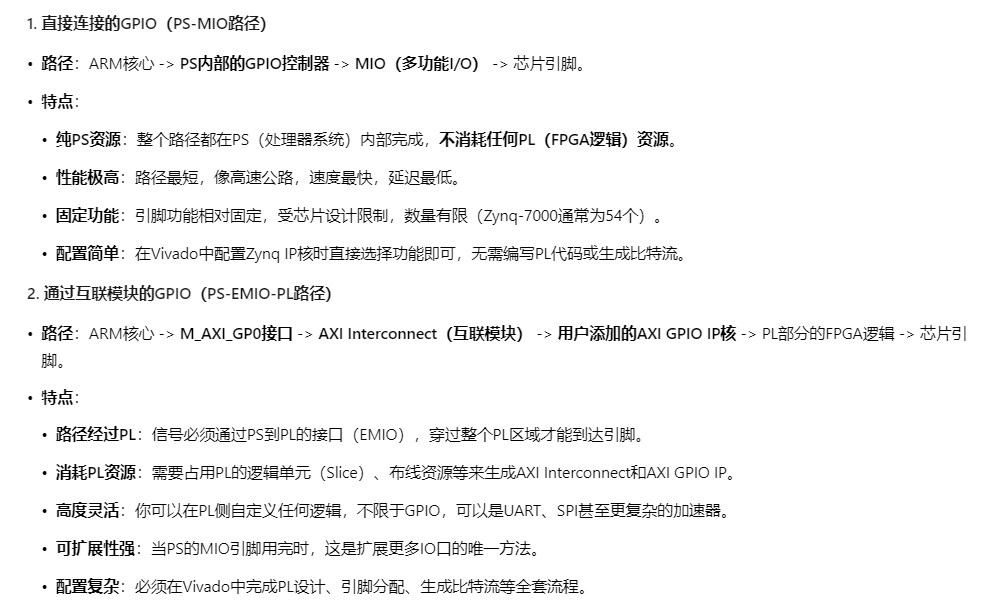 GPIO 可以通过 MIO 连接到 PS 端的引脚,也可以通过 EMIO 连接到 PL再到引脚。 mio是通过arm处理芯片和器件相互连接,emio是通过ps控制PL在到引脚。emio的时候,ps通过M_AXI_GPO的口然后进行互联和GPIO再输出,这些是EMIO 的路劲,再到管脚。