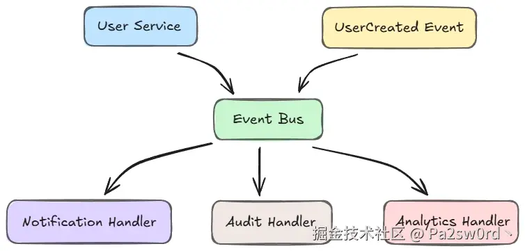 当用户创建时,UserService 只负责发出一个"用户创建"事件,由消息系统或事件处理器来决定是否发送欢迎邮件。