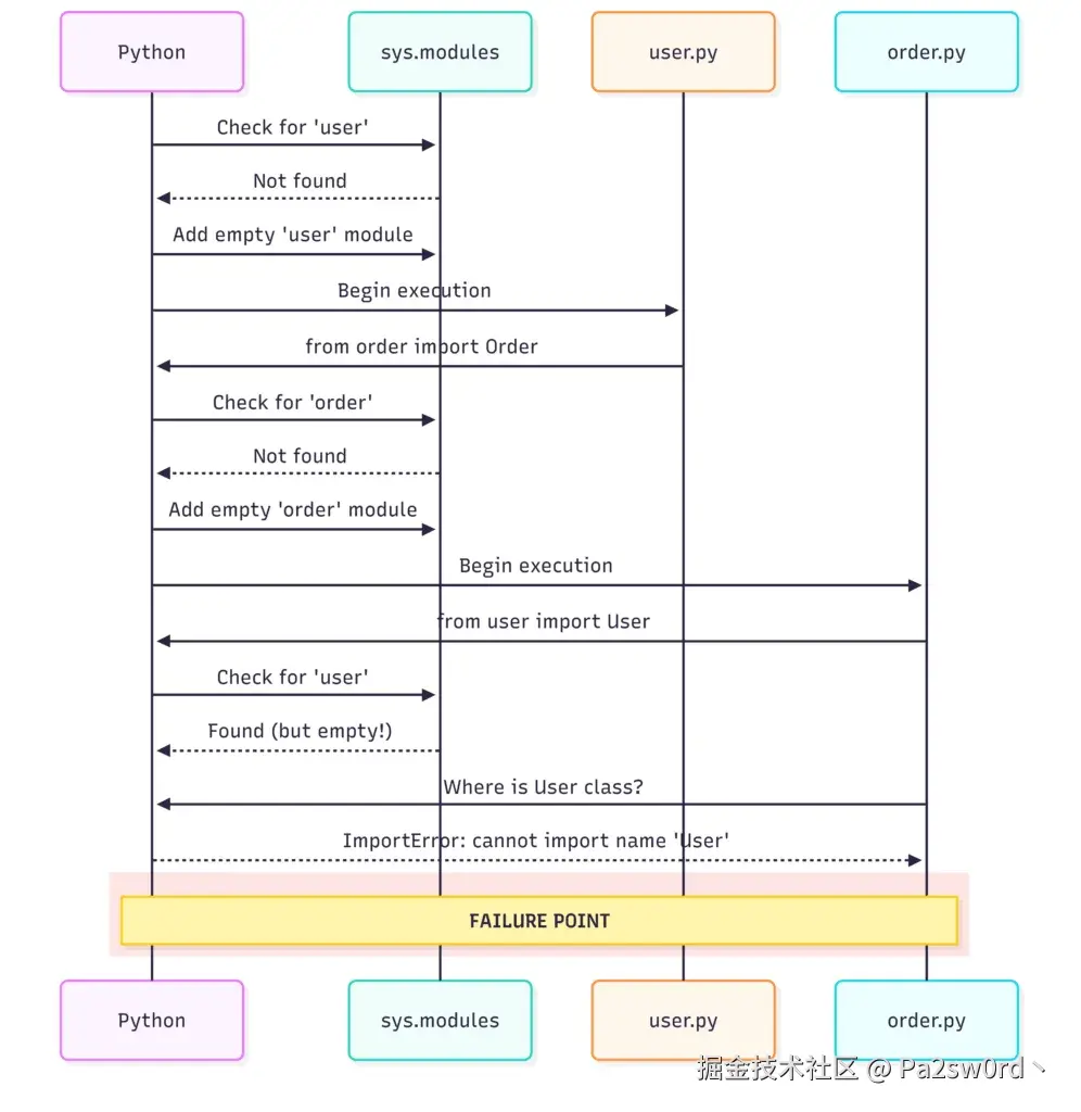 换句话说,失败发生在 order.py 试图导入 User 的瞬间。模块虽然已经存在于 sys.modules,但还没初始化完成,User 根本还不存在。