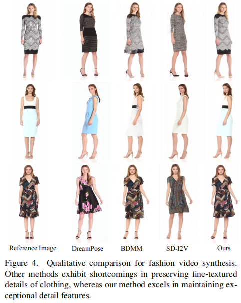 为了进行公平比较,研究团队还使用 DreamPose 的开源代码获取了其在不进行样本微调情况下的结果(标记为 DreamPose*),其各项指标均不如 Animate Anyone。在时尚视频领域,对服装细节的要求极高,其他方法往往无法保持服装细节的一致性,在颜色和精细结构元素方面还会出现明显错误,而 Animate Anyone 框架生成的结果能够有效保留服装细节的一致性,从图 4 的定性比较中也能直观地观察到这一点 。
