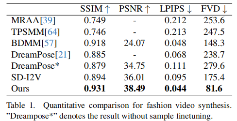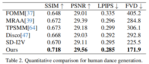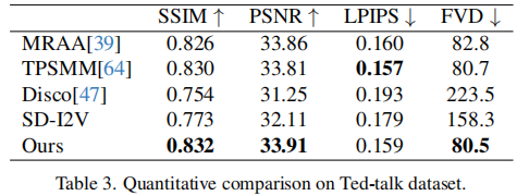 此外,为了与其他方法进行公平比较,研究团队还在三个特定的基准数据集(UBC 时尚视频数据集、TikTok 数据集和 Ted-talk 数据集)上训练模型,且未使用额外数据 。