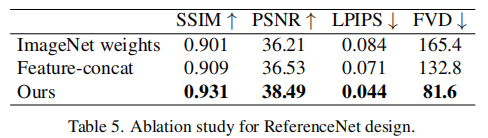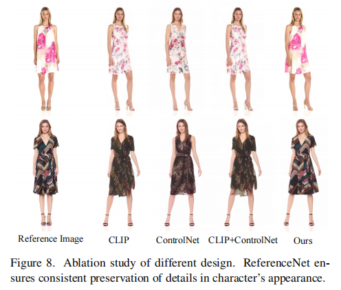 从图 8 的可视化结果可以看出,ReferenceNet 优于其他三种设计。仅依靠 CLIP 特征作为参考图像特征,虽然能够保持图像的相似性,但无法充分传递细节信息;ControlNet 并没有改善结果,因为其特征缺乏空间对应性,不适用该任务 。
