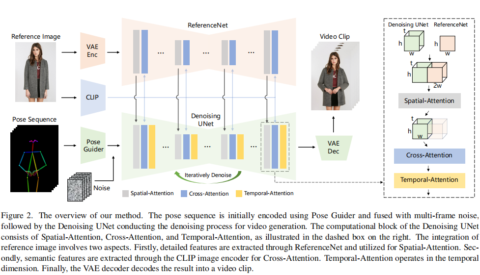 Animate Anyone 框架的网络架构在 SD 基础上进行了扩展和创新,主要包含 ReferenceNet、姿态引导器(Pose Guider)和时间层(Temporal Layer)三个关键组件,整体架构如图 2 所示。