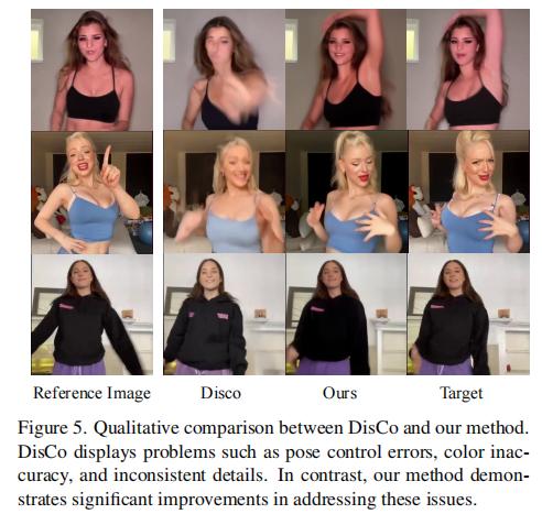 从图 5 的定性比较可以看出,在复杂的舞蹈序列中,Animate Anyone 框架能够在整个运动过程中保持视觉连续性,并且在处理不同角色外观时具有更强的鲁棒性,而 DisCo 则存在姿态控制误差、颜色不准确和细节不一致等问题 。