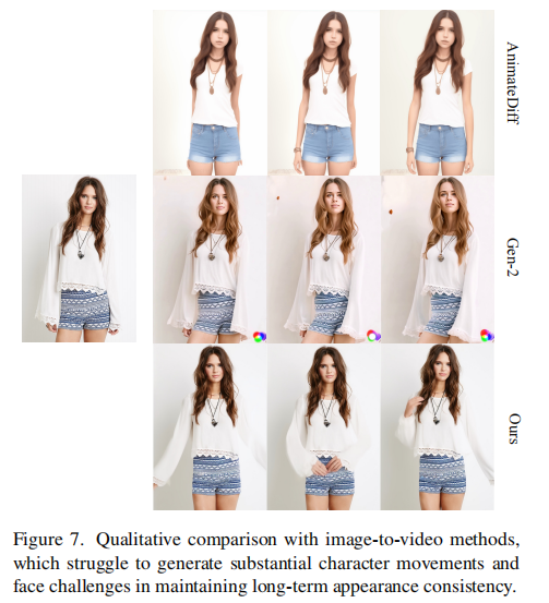 目前,有许多研究基于大规模训练数据提出了具有强大生成能力的视频 diffusion 模型。研究团队选取了两种最著名且有效的图像到视频方法(AnimateDiff 和 Gen2)进行比较。由于这两种方法不进行姿态控制,因此仅比较它们在保持参考图像外观保真度方面的能力 。