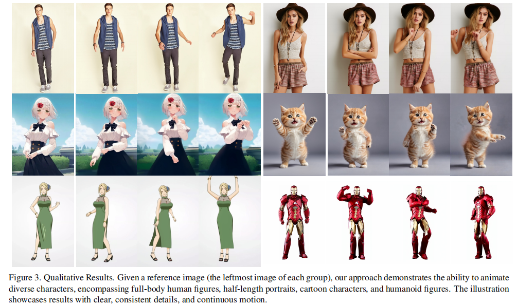 从图 3 可以清晰地看出,Animate Anyone 框架能够对多种类型的角色进行动画处理,包括全身人体、半身肖像、卡通角色和类人角色 。