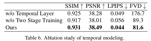 定量结果如表 6 所示。不使用时间层会导致明显的纹理粘连和帧间抖动,使得 FVD 指标大幅下降;不采用两阶段训练时,图像质量相关指标会下降。这是因为当同时对多帧进行优化时,网络更倾向于关注整体的时间视觉连贯性,从而降低了对单个帧细节的关注度。而两阶段训练方法能够同时确保生成视频帧的质量和时间平滑性 。