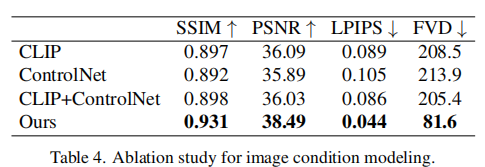 为证明所提出的图像条件建模方法的有效性,研究团队探索了三种替代设计,并在 UBC 时尚视频数据集上进行了实验: