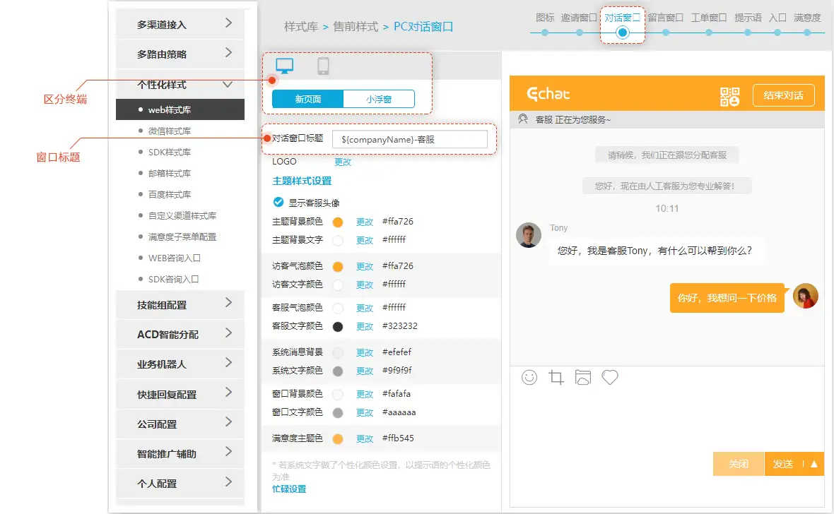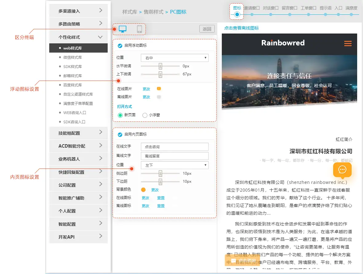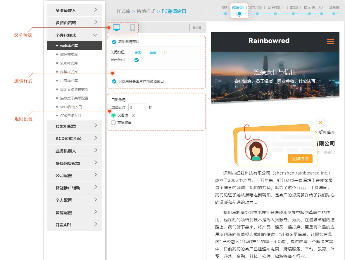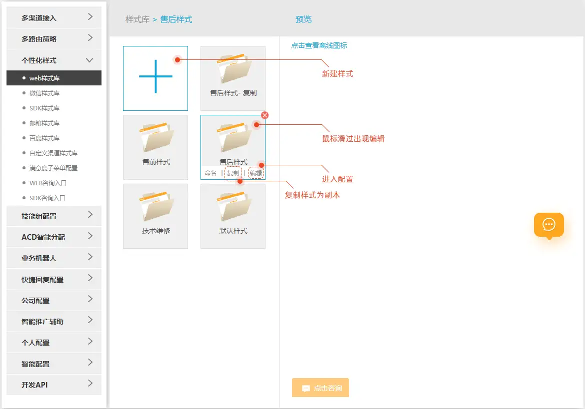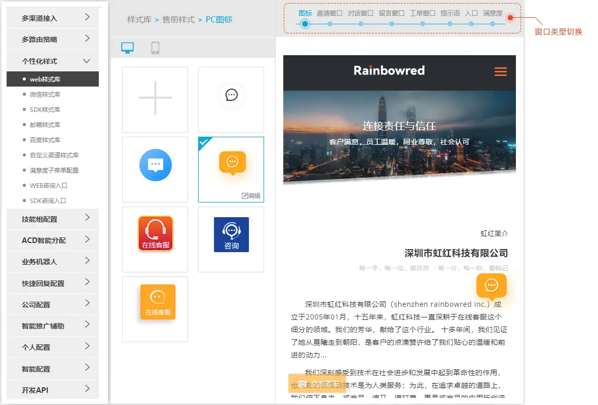 - 每个样式库内进行具体窗口设置,包括:图标、对话窗口、提示语、留言窗口及满意度等
