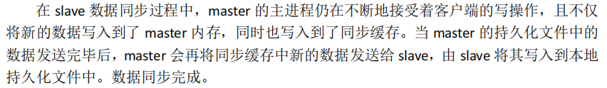 - 持久化完毕后 master 会再 fork 出一个子进程,让该子进程以异步方式将数据发送给 slave。slave 会将接收到的数据不断写入到本地的持久化文件中。