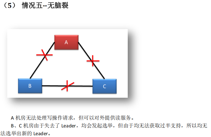 若新 Leader 出现在 B 机房,A 机房是感知不到新 Leader 的诞生的,其不会自动下课,所以会形成脑裂。但由于 A 机房 Leader 处理的写操作请求无法获取到过半响应,所以无法完成写操作。但 B 机房 Leader 的写操作处理是可以获取到过半响应的,所以可以完成写操作。故,A 机房与 B、C 机房中出现脑裂,且形成了数据的不一致。