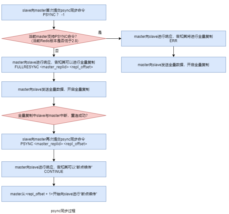 如果复制过程中断后 slave 与 master 成功连接,则 slave 再次提交 psyn 命令。此时的 psyn 命令的 repl_offset 参数为其前面已经完成复制的数据的偏移量。