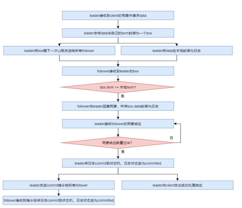 ① leader 在接收到 client 的写操作请求后,leader 会将数据与 term 封装为一个 box,并随着下一次心跳发送给所有 followers,以征求大家对该 box 的意见。同时在本地将数据封装为日志;