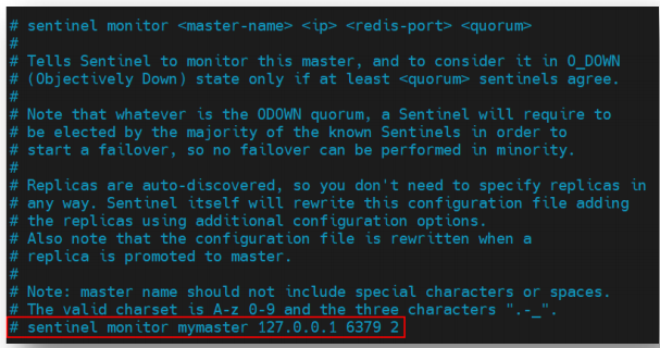 如果要添加的是 Sentinel 节点,无论其是否曾经出现在 Sentinel 集群中,都需要手工完成。即添加者在添加之前必须知道当前 master 是谁,然后在配置文件中修改 sentinel monitor 属性,指定要监控的 master。然后启动 Sentinel 即可;