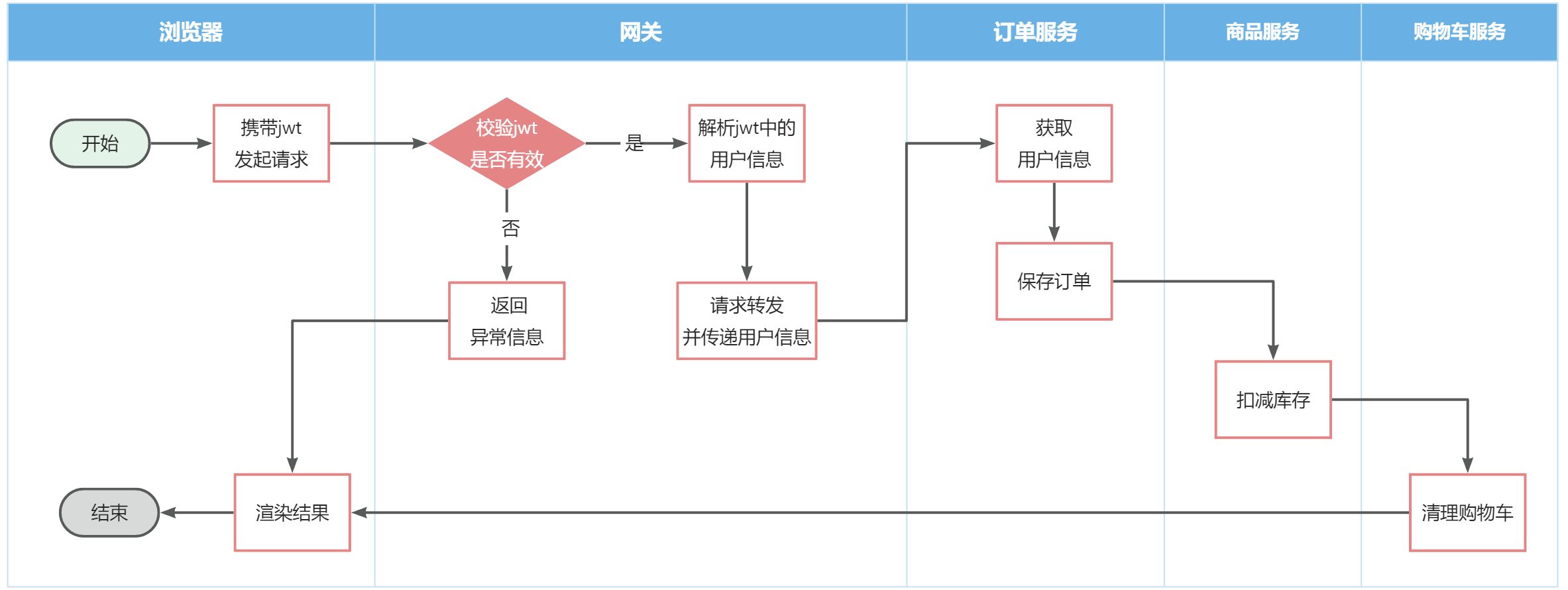 - 通过认证后,网关再根据请求判断应该访问哪个微服务,将请求转发过去