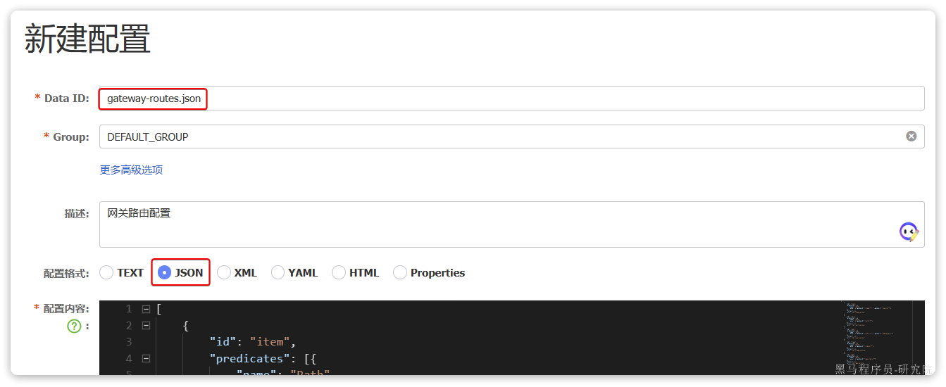 接下来,我们直接在Nacos控制台添加路由,路由文件名为gateway-routes.json,类型为json: