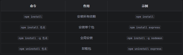 javascript# 目录结构 backend/ ├── package.json └── (没有node_modules) # 执行命令 npm install # 结果 backend/ ├── package.json ├── package-lock.json # 新生成 └── node_modules/ # 新生成,包含所有依赖6. 总结