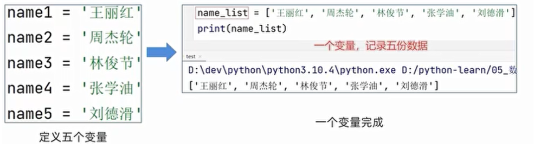 思考一个问题:如果我们想要再程序中,记录5名学生我的信息,如姓名。该怎么做?