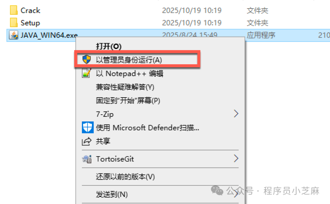 1、下载的压缩包解压。我们先安装 JAVA_WIN64 程序,鼠标右键选择【以管理员身份运行】