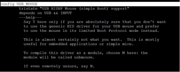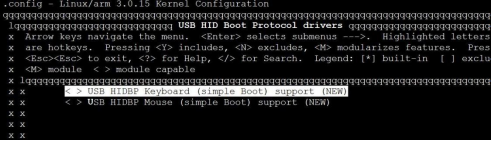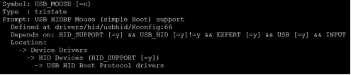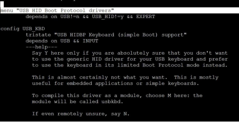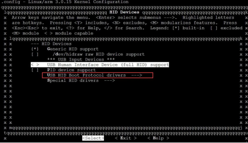 如上图所示,注意以下的提示,这部分意思是,菜单"USB HID Boot Protocol drivers"需要依赖"USB!=n && USB_HID!=y && EXPERT",也就是必须定义"USB", 没有定义"USB_HID",这部分菜单才会显示出来。请注意这种配置在内核中经常会遇到。