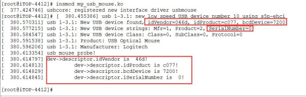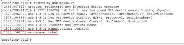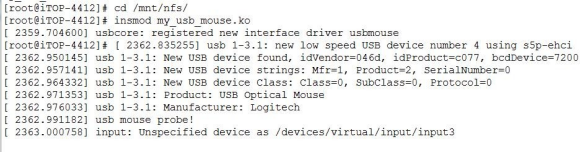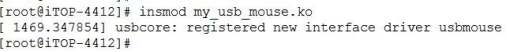 如上图所示,这部分是 usbcore 打印的,和我们的驱动中的代码没有直接的关系,在加载 usb 鼠标驱动之后,打印"注册了新的驱动,叫 usbmouse"。