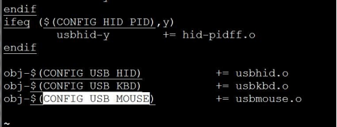 接着使用命令"vim drivers/hid/usbhid/Makefile",打开 Makefile 文件,可以看到编译条件是宏"CONFIG_USB_MOUSE"。