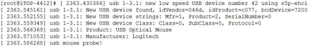 在内核中没有 USB 鼠标驱动的时候插入 USB 鼠标,可以看到一些打印信息,这些信息是主控制器部分来完成的,我们在 probe 中打印 USB 设备的一些信息,来做个验证。