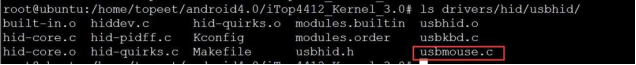 在内核配置编译之后,如下图所示,使用命令"ls drivers/hid/usbhid/ ",可以看到"usbmouse.c"并没有被编译,可以我们的内核明显是可以支持 USB 鼠标的。