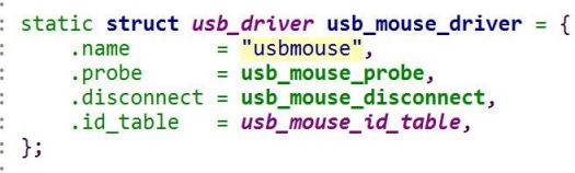我们需要注意的是,USB 驱动是可以热拔插的,再插入和拔掉设备的时候,肯定都需要对应的代码,如下图所示,可以看到 struct usb_driver usb_mouse_driver 中有定义usb_mouse_probe 和 usb_mouse_disconnect。