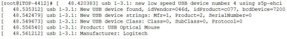 在不加载 USB 鼠标驱动的情况下,插上 USB 鼠标,也是可以看到打印信息的,如下图所示。可以看到 idVendor, idProduct, bcdDevice 等信息,我们后面就在 probe 中添加这几个参数的打印信息,对比验证下。