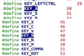 如上图所示,打印了 0x1e 和 0x30,转化为十进制为 30 和 48,如下图所示,KEY_A 和KEY_B 的数值为 30 和 48,和驱动代码中的设置一一对应。