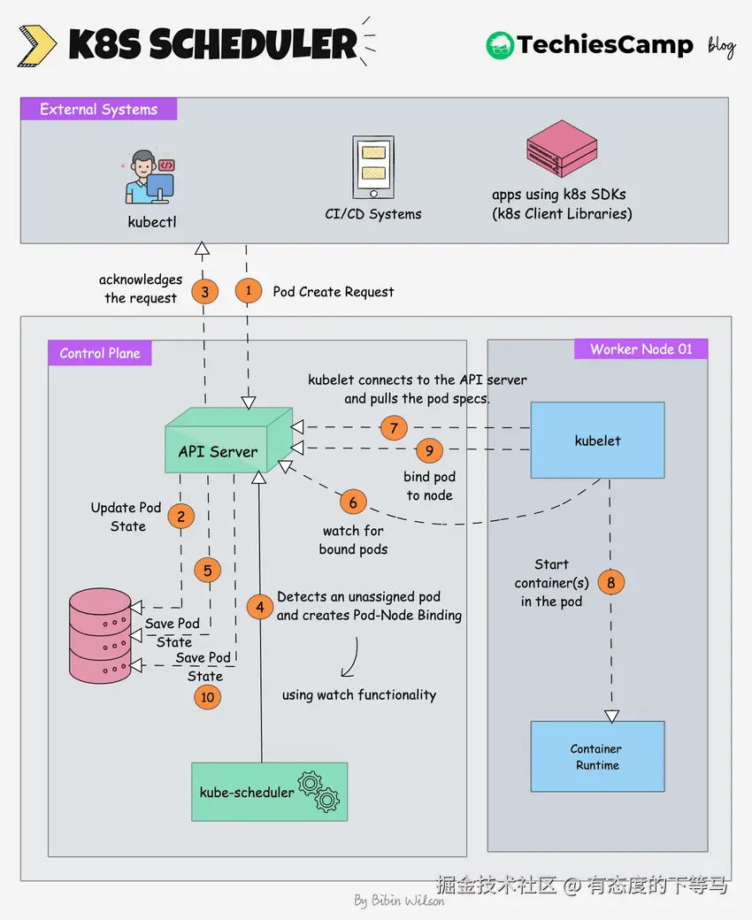 scheduler更新etcd中pod的状态(通过api server): ① 标记pod为"scheduled"状态 ② 记录被分配的节点。