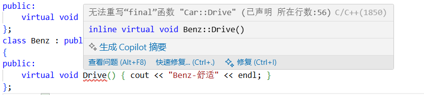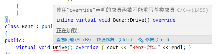 virtual void Drive() { cout << "Benz-舒适" << endl; }
