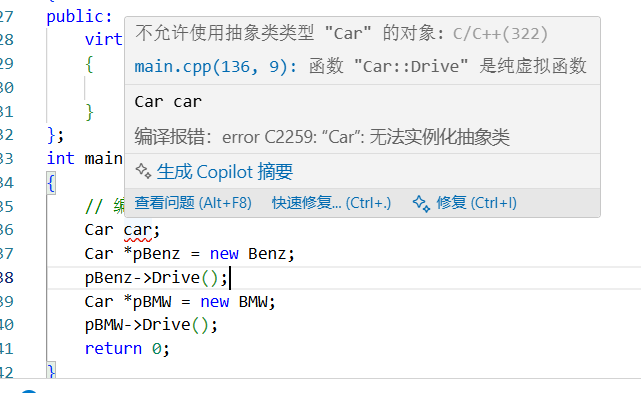 // 编译报错:error C2259: "Car": ⽆法实例化抽象类