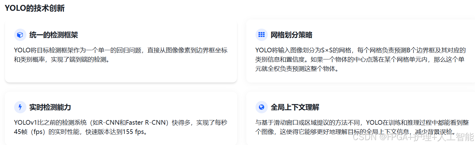 YOLOv1(2016 年) :Joseph Redmon 等人提出的 YOLO 首次将目标检测简化为单一回归问题,抛弃了复杂的候选区域生成流程,通过网格划分直接预测目标位置和类别,实现了 45FPS 的实时检测性能,快速版本达到 155FPS(127)。