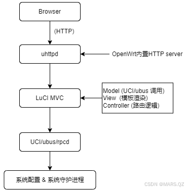 | Controller | 处理请求 & 调 UCI/ubus | /usr/lib/lua/luci/controller/... |