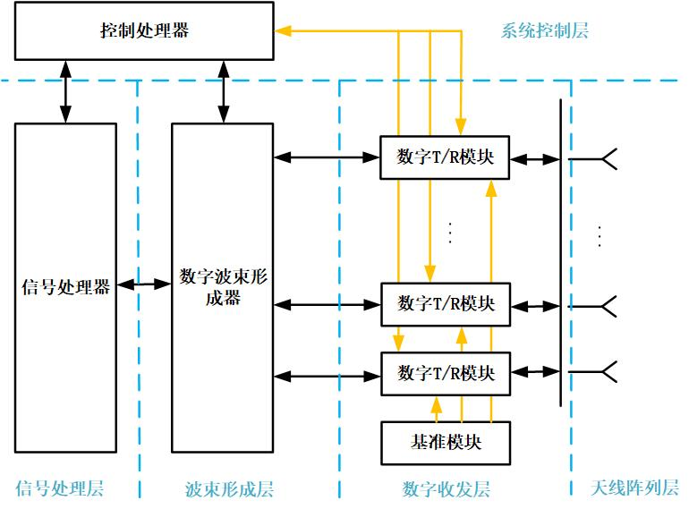 如图1所示,数字阵列雷达的系统架构可分为天线阵列层、数字收发层、波束形成层、信号处理层及系统控制层五个核心层级,各层级高度集成且协同工作,共同实现雷达的探测、跟踪与数据处理功能。