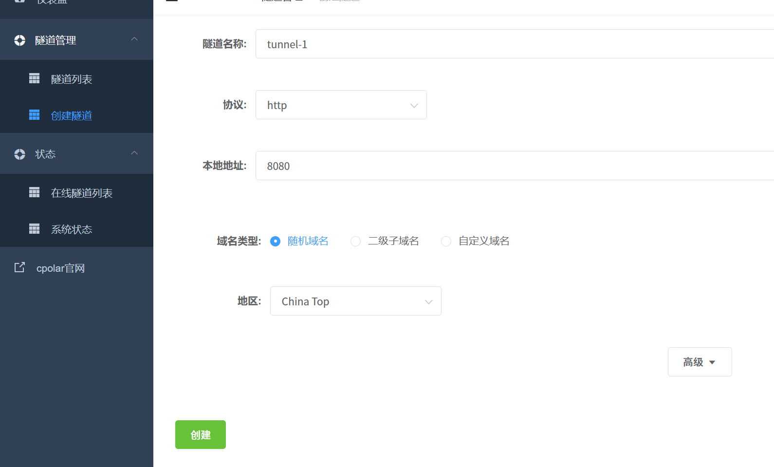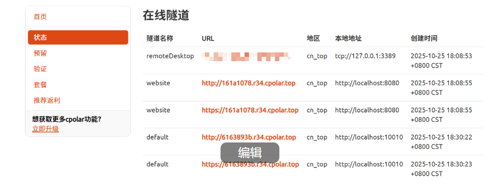 然后在网页点击状态就能查看到在线隧道的地址了,和上面命令行的其实也是对应的(8080好像就是之前苍穹外卖搞的)。当然这个域名是临时的域名,如果重启cpolar服务后,域名又会更新为其他的
