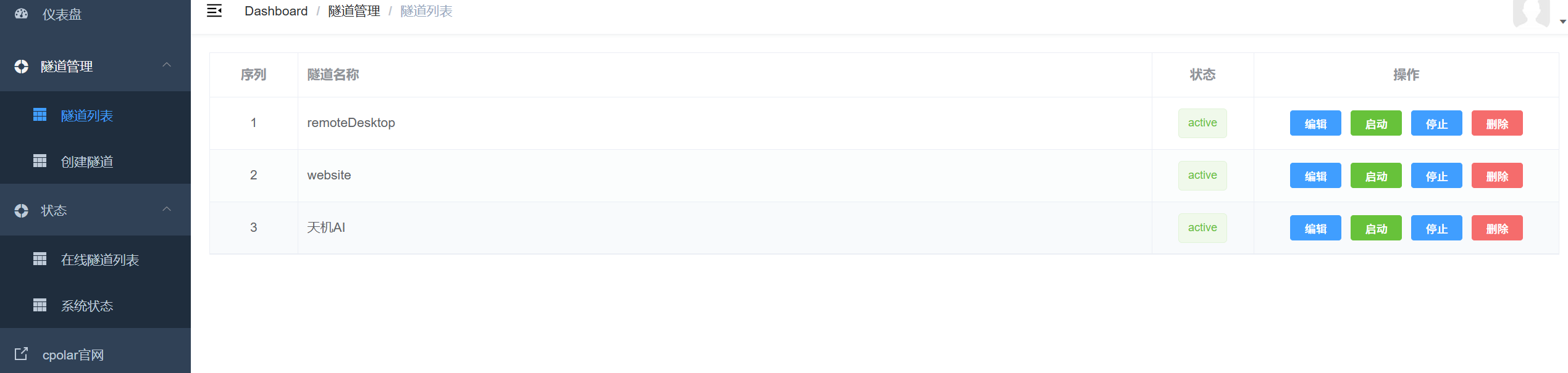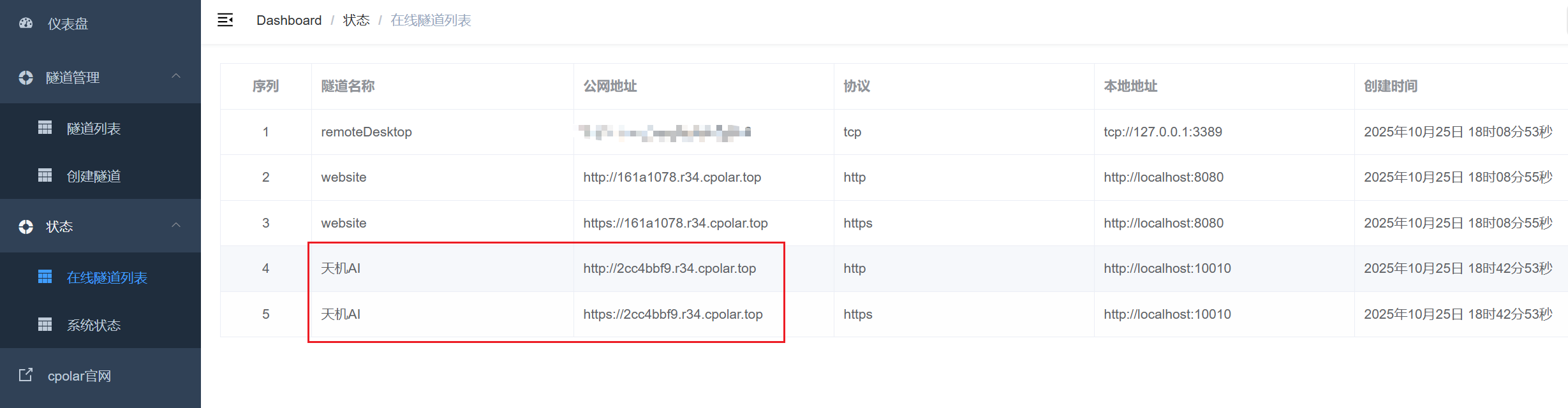 创建之后在隧道列表就可以看到我命名为天机AI的隧道了(刚刚命令行窗口一关,这里是没有10010的端口的)
