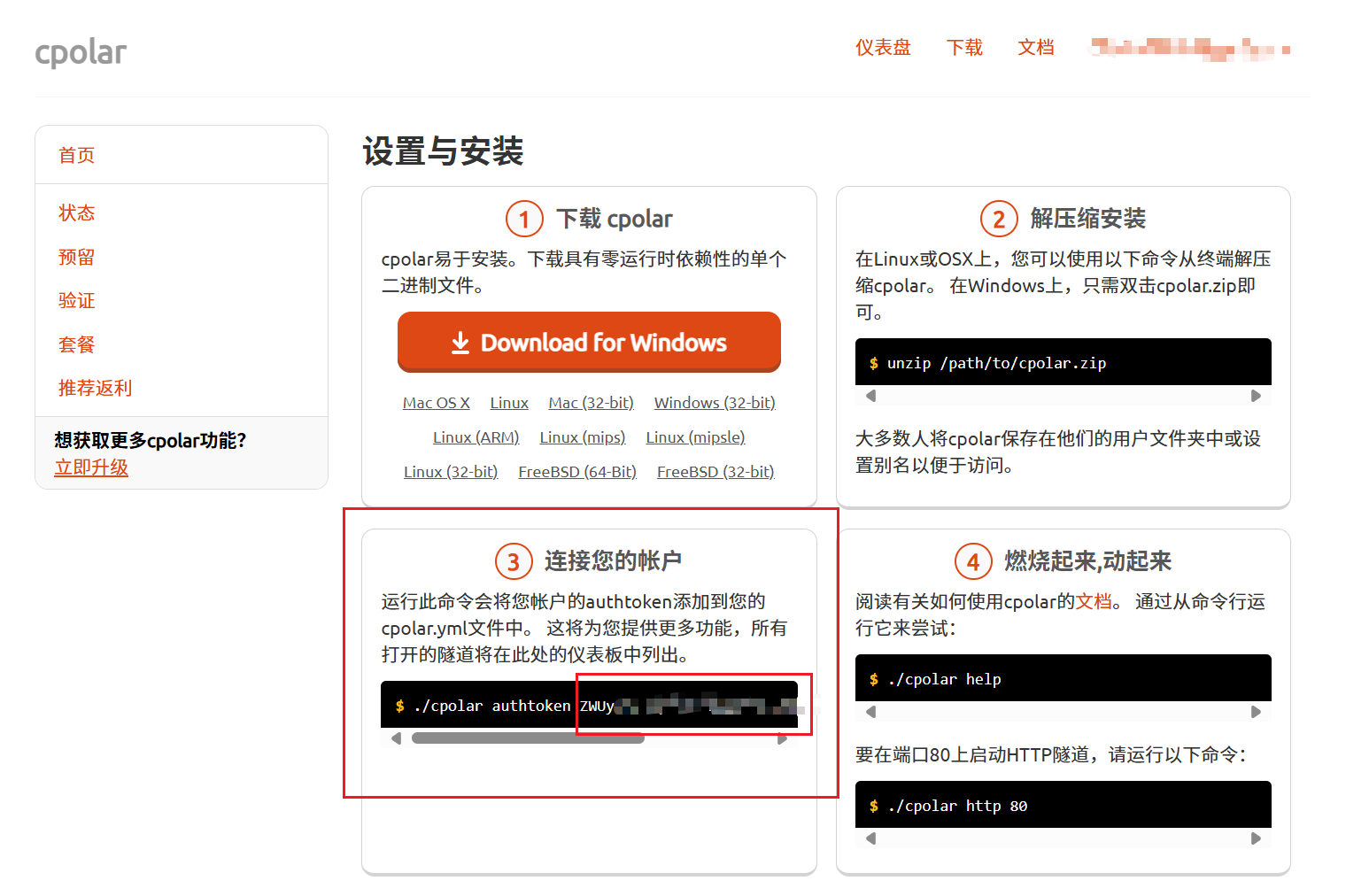 登录之后的网页就能看到连接您的账户,下面就给出了cpolar authtoken xxxxxx的指令。后面的一大串就是你自己的token,每个人的token不一样,同时token只需要在命令行窗口中设置一次即可