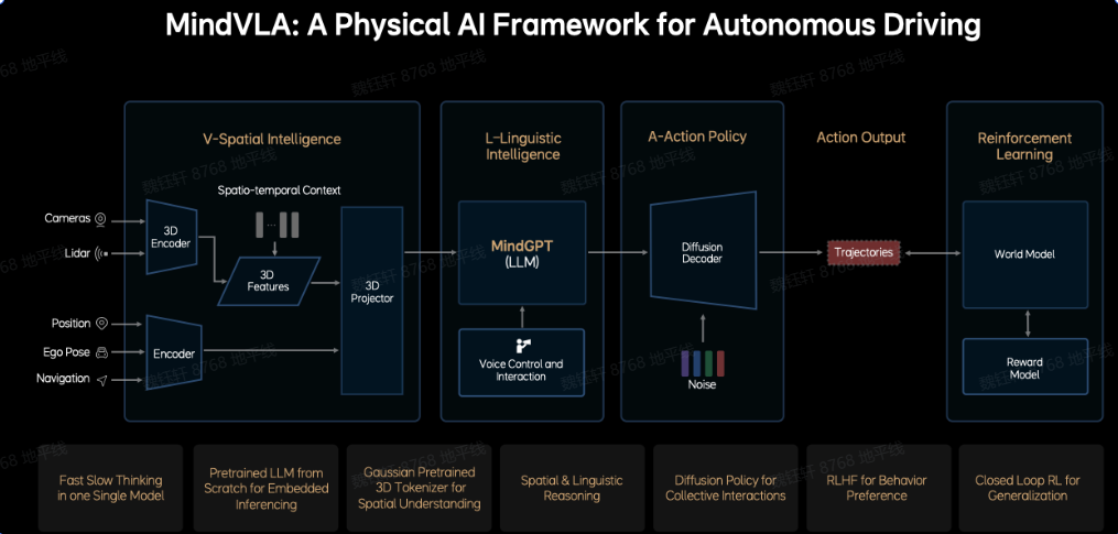 MindVLA 整合空间智能、语言智能和行为智能,基于端到端和 VLM 双系统架构,通过 3D 空间编码器和逻辑推理生成合理的驾驶决策(LM),并利用扩散模型优化驾驶轨迹。LLM 基座模型采用 MoE 混合专家架构和稀疏注意力技术。