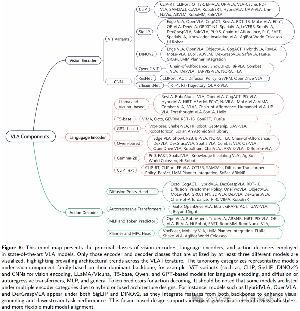 - ResNet、EfficientNet 等基于 CNN 的编码器则出现在 CLIPort、ACT、RT-1、QUAR-VLA 等模型中;