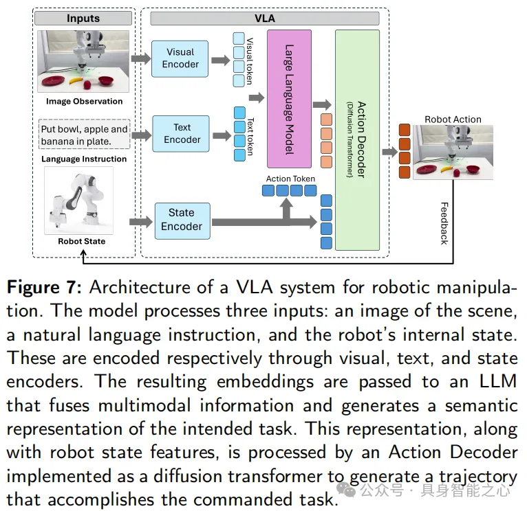 VLA 模型典型结构如下,围绕视觉编码器、语言编码器和动作解码器三个关联模块构建