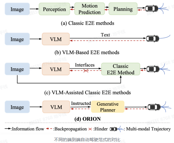 通过视觉语言指令指导轨迹生成的端到端自动驾驶框架。ORION 引入了 QT-Former 用于聚合长期历史上下文信息,VLM 用于驾驶场景理解和推理,并启发式地利用生成模型对齐了推理空间与动作空间,实现了视觉问答(VQA)和规划任务的统一端到端优化。