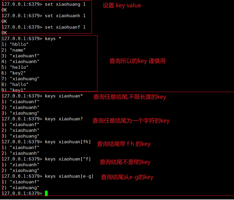 keys: 用来查询当前服务器上匹配的 key. 通过搭配一些特殊符号(通配符)来描述 key, 查询出匹配出来的key