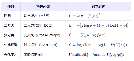 | 强化学习 | 策略梯度损失 | $ \mathcal{L} = -\mathbb{E}[\log \pi(a |