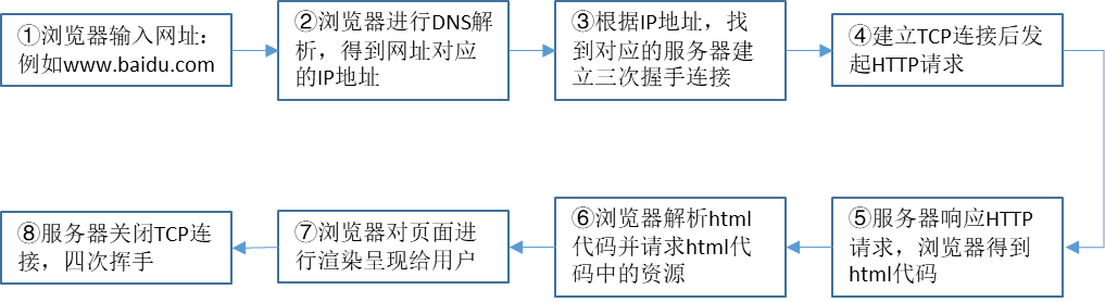从互联网七层模型中我们可以看到,HTTP属于应用层,应用层决定了向用户提供应用服务时通信的活动,它构建于 TCP 协议之上,HTTP 协议也处于该层。TCP/IP 协议族内预存了各类通用的应用服务。比如,FTP(File Transfer Protocol,文件传输协议)和 DNS(Domain Name System,域名系统)服务就是其中两类。HTTP工作流程如下图所示