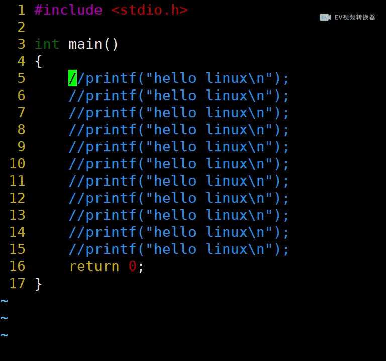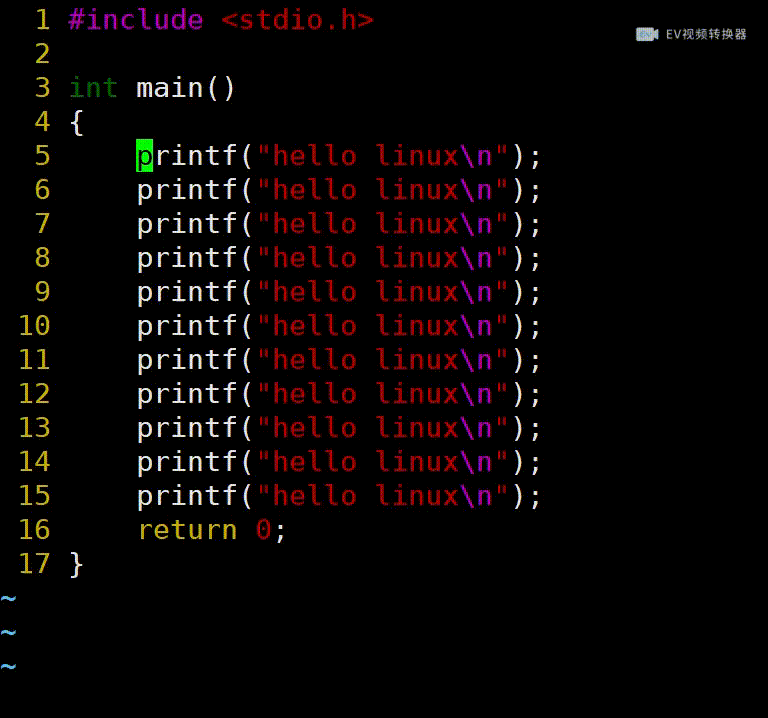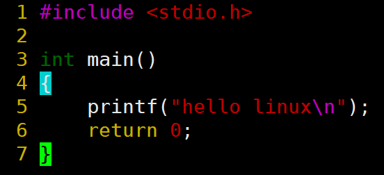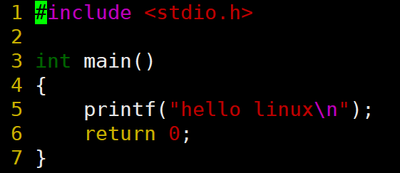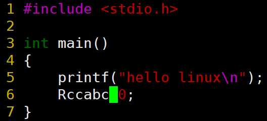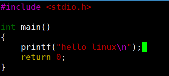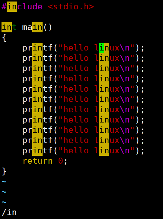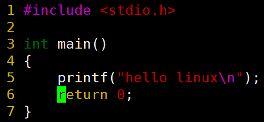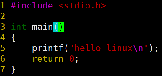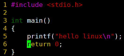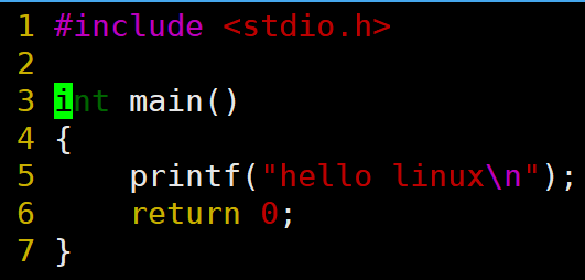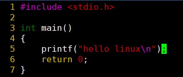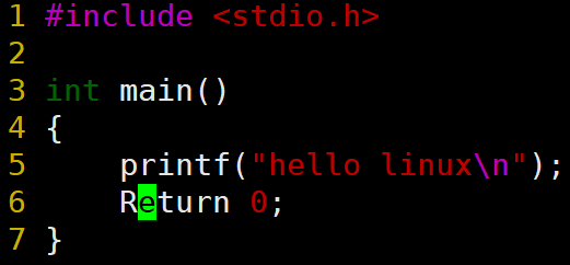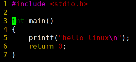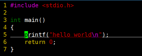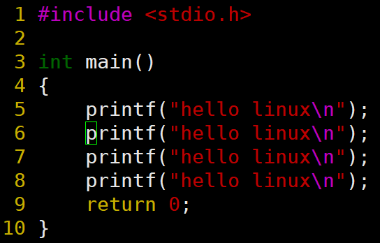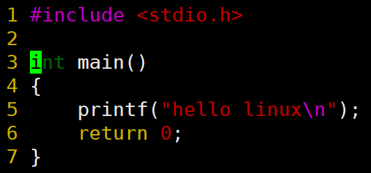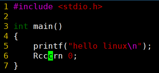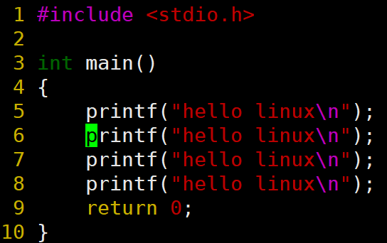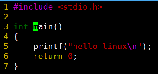 通过上面三种模式的互相转换,我们已经可以在vim中编写C程序了,下面我们以该C程序为例,学习vim的基本操作和常用命令。